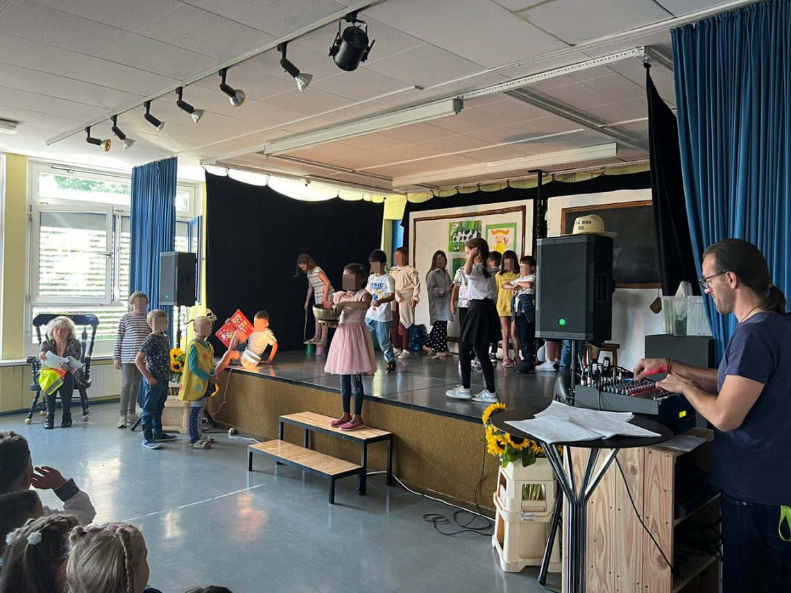 70 neue Kinder begrüßte das Schulleitungsteam aus Herrn Schmidt, Frau Hauser und Frau Gefeller am vergangenen Samstag in der Grundstufe am Campus Hannah Höch. Die aufgeregten neuen Erstklässler*innen und ihre Eltern erlebten während der Einschulungsfeier im gefüllten Mehrzweckraum ein buntes Programm: Schüler*innen der zweiten und dritten Jahrgangsstufen führten einen Sketch über gesundes Essen und die Spielmöglichkeiten im Mittagsband vor. Außerdem sangen sie ein Schulweglied, einen englischen Song über Tiere und “Lesen heißt auf Wolken fliegen“.