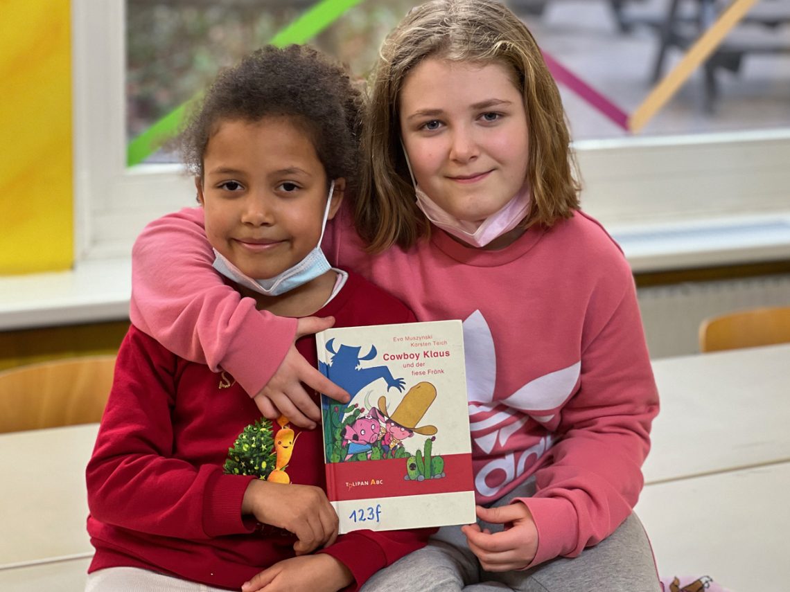 Wir haben „Cowboy Klaus und der fiese Fränk“ in einer der Bücherkisten in unserer Lerngruppe 123f. Isabella hat das Buch bereits durchgelesen, und Alia hat es angefangen. Wir finden beide das Buch spannend, lustig und cool. Wenn ihr in einer 123er-Klasse seid, dann solltet ihr es deshalb auch unbedingt lesen.