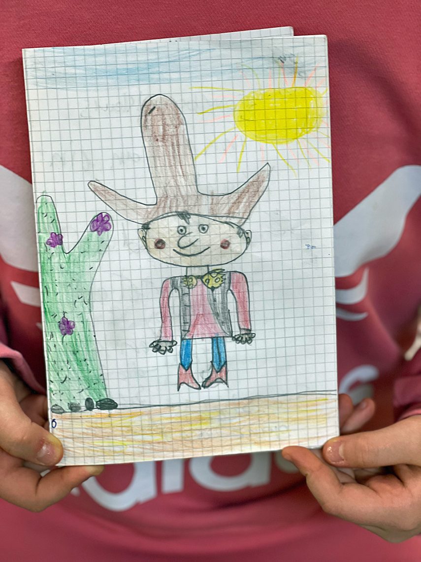 Isabella hat ein Bild mit Cowboy Klaus und einem Kaktus gemalt.