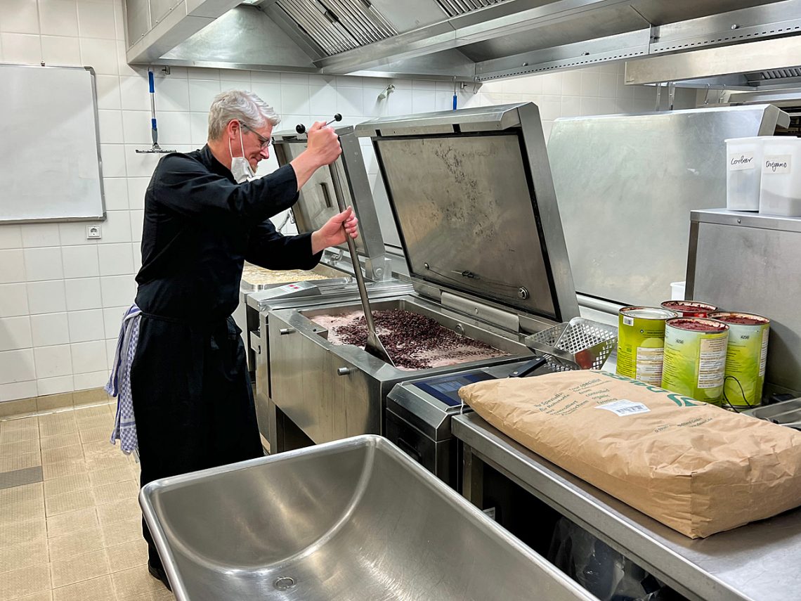 Während Herr Wewer und Frau Ernst, die Office Managerin, uns durch die Küche führen, bereiten die Köch*innen gerade in riesigen verschließbaren Kochbecken Chili con Carne und als Alternative die vegetarische Variante Chilli sin carne zu. 250 kg Bio- Rinderhackfleisch sowie Bohnen und Mais werden dafür verwendet, dazu kommen beim Auffüllen Nudeln, die jetzt noch in Tüten einen ganzen Rollwagen befüllen. Zum Umrühren der Bohnen und Mais greifen die Köch*innen zu riesigen Rührbesen und Schöpfkellen.