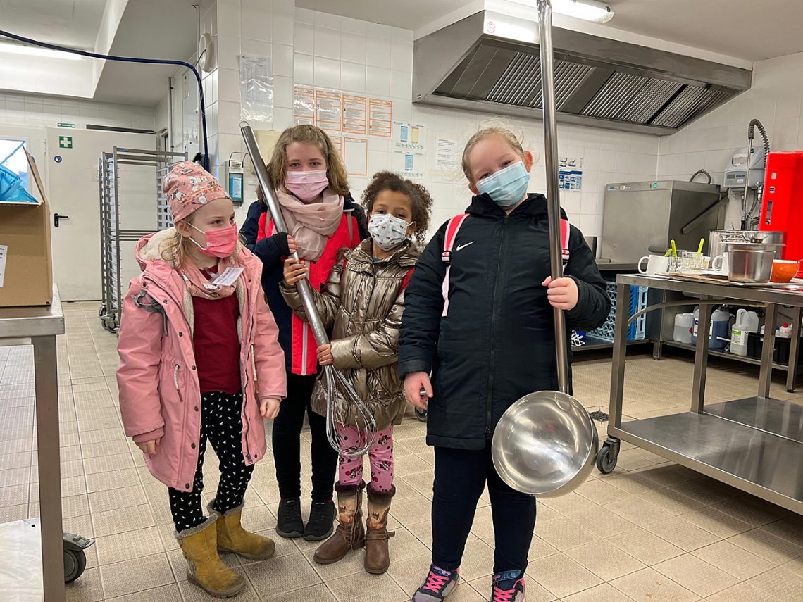 Ein Blick auf den Essensplan zeigt: Montag ist der Suppentag, dienstags und manchmal mittwochs gibt es üblicherweise auch Fleischgerichte, Donnerstag ist Veggie Day und Freitag ist ganz klassisch Fischtag. In den Schulmensen können die Kinder und Jugendlichen auf ausliegenden Feedback-Zetteln ihre Meinung zum Essen mitteilen und auch Essenswünsche äußern. Häufig wünschen sich die Schüler*innen Reibekuchen mit Apfelkompott, berichtet uns Herr Wewer. Aber auch Döner, Pizza, Burger, Nudeln oder auch Möhreneintopf tauchen auf den Wunschzetteln auf.