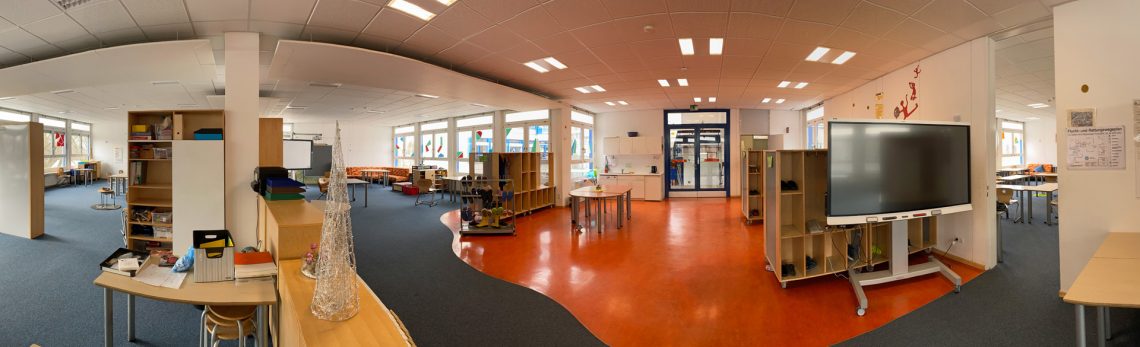 Bis vor ungefähr 10 Jahren gab es überall an der Hannah Höch nur geschlossene Klassenzimmer. Dann jedoch wurden in Haus 1 in den A-, B- und C-Lerngruppen der Grundstufe die Türen und Wände der Klassenräume entfernt. Dadurch entstand ein großer Raum über die gesamte Etage. Mit Schränken und leichten Trennwänden wurde für jede Lerngruppe ein eigener Bereich abgegrenzt — aber eben ohne Tür und ohne massive Wände.
