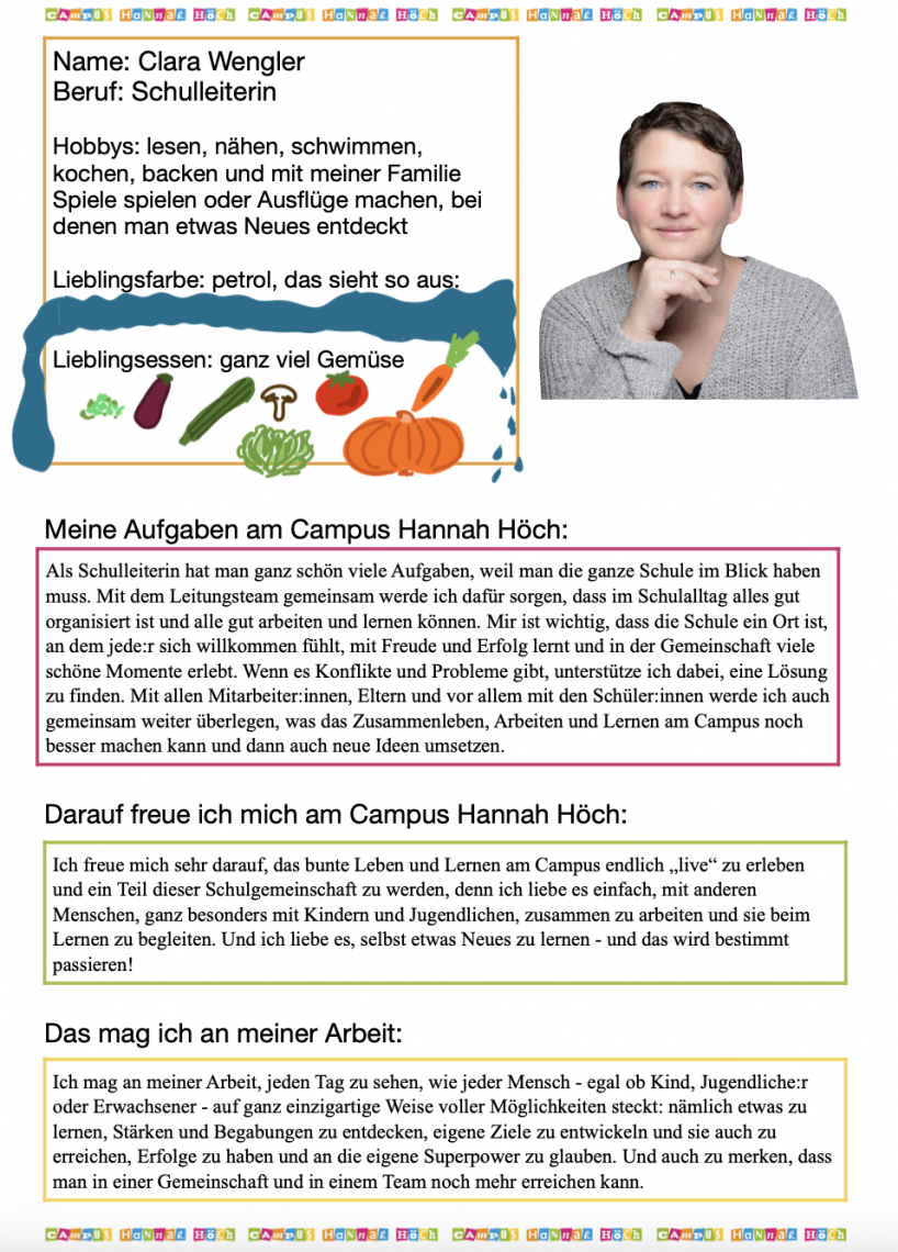 Frau Wengler hat am heutigen Montag nach den Herbstferien ihren ersten Arbeitstag am Campus und stellt sich zunächst den neuen Kolleg*innen am Campus Hannah Höch vor. Im Laufe der Woche wird sie sich auch direkt an die Kinder und Jugendlichen an unserer Schule und deren Eltern wenden.