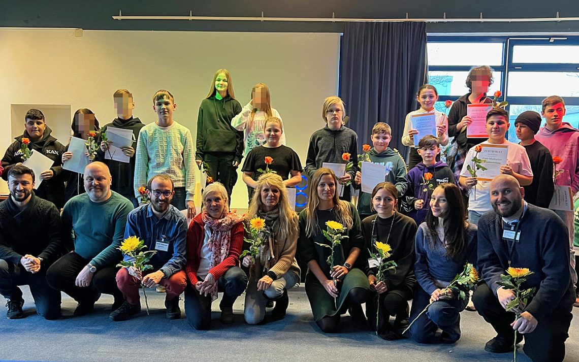 „Konflikte gehören an Schulen dazu. In ihnen stecken auch Chancen. Mediation ist die wertvolle Fähigkeit, den in Konflikt miteinander Stehenden zu helfen, diese Chancen auch zu sehen“, sagte Schulleiterin Clara Wengler bei der Verleihung der Zertifikate und dankte dabei allen Teilnehmer*innen und Unterstützer*innen, darunter auch ihrer Vorgängerin Frau Ristow, die das Projekt mit ins Rollen brachte. Und an die frisch gebackenen Mediator*innen gerichtet sagte Frau Wengler: „Dass ihr anderen beim konstruktiven Lösen ihrer Konflikte helft, ist ein großer Schatz für unsere Schule. Ihr werdet mit jedem gelösten Konflikt wachsen und habt es verdient, diesen Moment zu feiern.“
