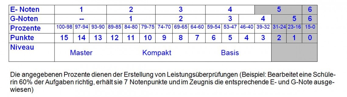 Ab der Jahrgangsstufe 7 erfolgt die Leistungsrückmeldung am Campus ergänzend zu den vielfältigen Formen des lernförderlichen „formativen“ Feedbacks auch durch ein Zeugnis mit Noten und Punkten gemäß der nachfolgenden Tabelle (gemäß der aktuellen Sekundarstufen I-Verordnung). In den Bilanz- und Zielgesprächen werden die Zensuren gemeinsam mit den Schüler:innen und mindestens einem Erziehungsberechtigten besprochen.