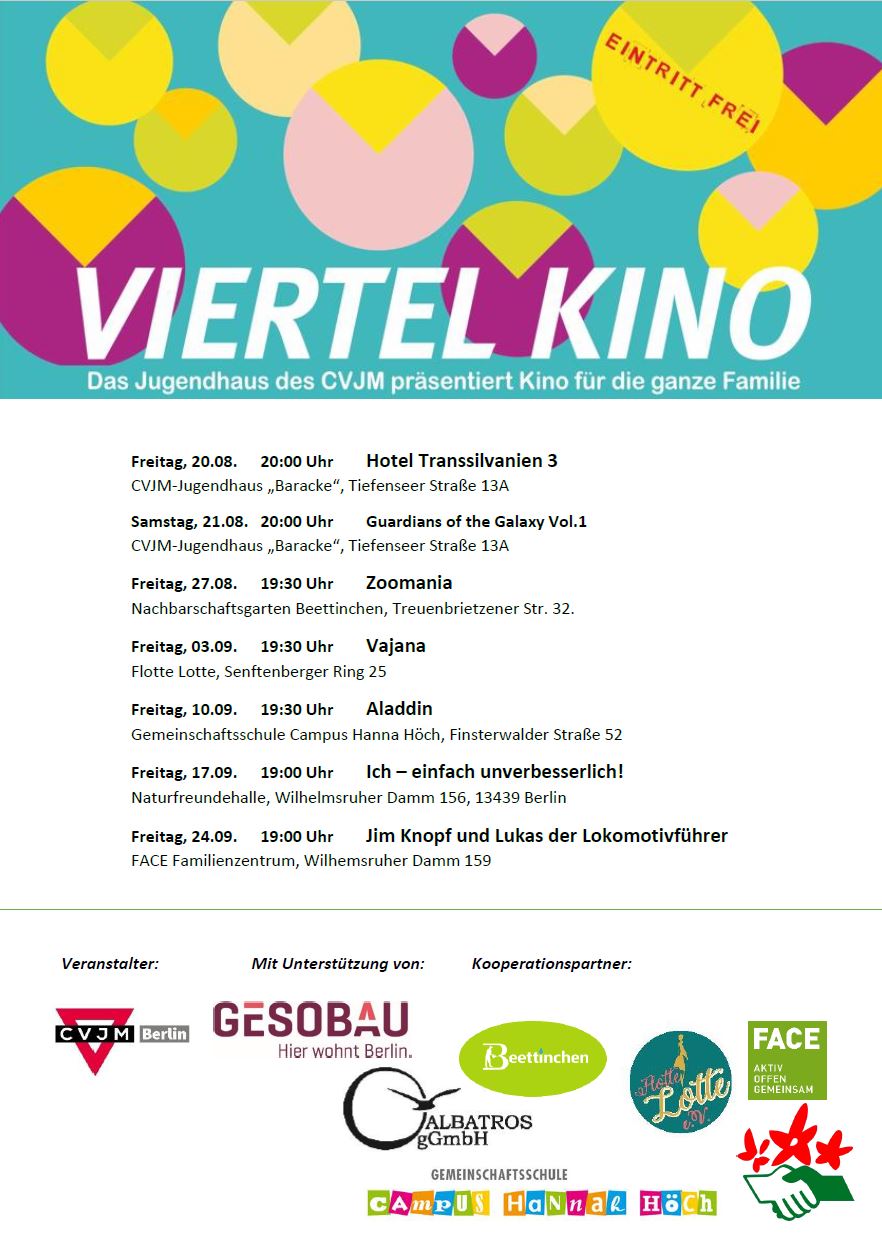 Veranstalter des Viertelkinos ist der CVJM Berlin. Im Wochenrhythmus werden Kinofilme an wechselnden Orten im Märkischen Viertel gezeigt. Die Gemeinschaftsschule Campus Hannah Höch ist einer der Kooperationspartner für die Veranstaltungsreihe.