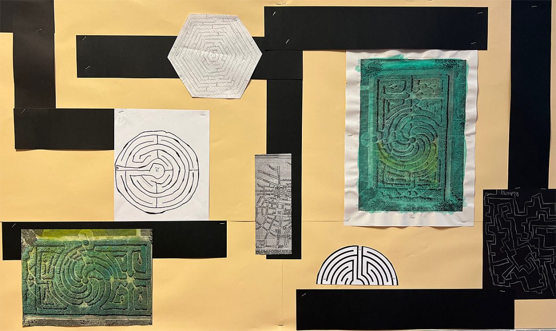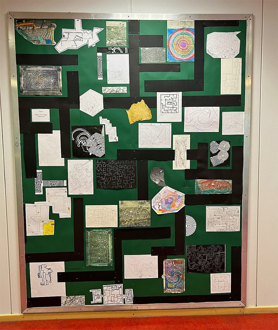 Wie sieht es zum Beispiel aus, wenn ein mit Farbe beschmierter Fahrradreifen statt auf einem Radweg auf einer Papierbahn bewegt wird? Und was hat es mit den Wegen und Irrwegen von Labyrinthen, die natürlich selbst von den Schüler*innen gestaltet wurden, auf sich?