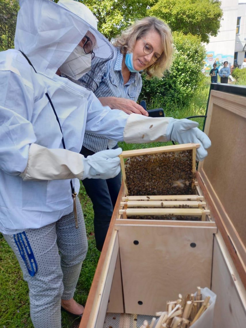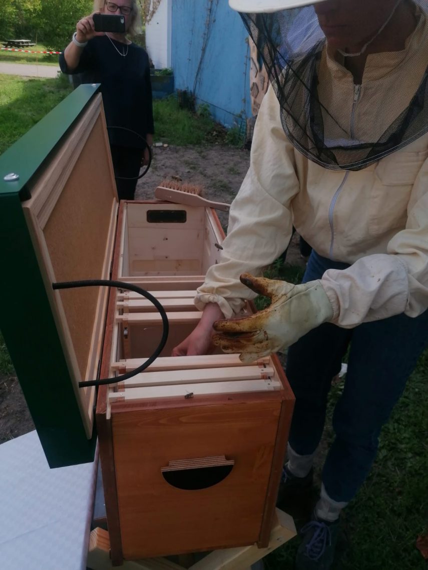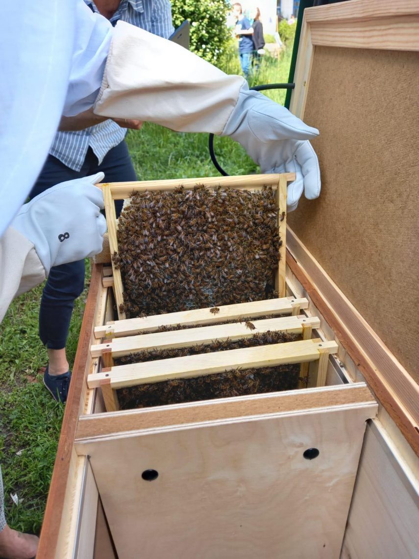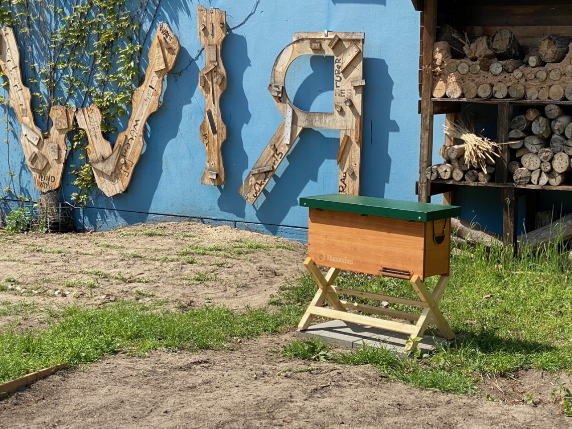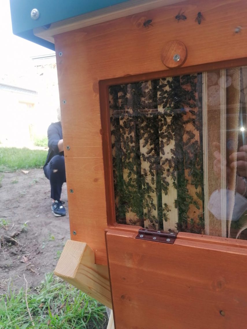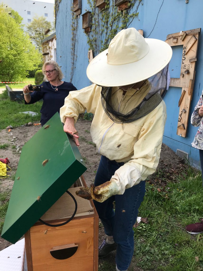 Rechtzeitig zum Weltbienentag ist der Campus Hannah Höch zur Heimat von Bienen geworden. Der erste Bienenschwarm hat bereits mit seiner Königin seinen Stock bezogen und fleißig Waben gebaut. Der zweite Bienenstand wird in Kürze auf der Wiese zwischen den Außengelände-Bereichen der Grund- und der Mittelstufe aufgestellt und bezogen.