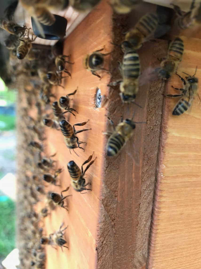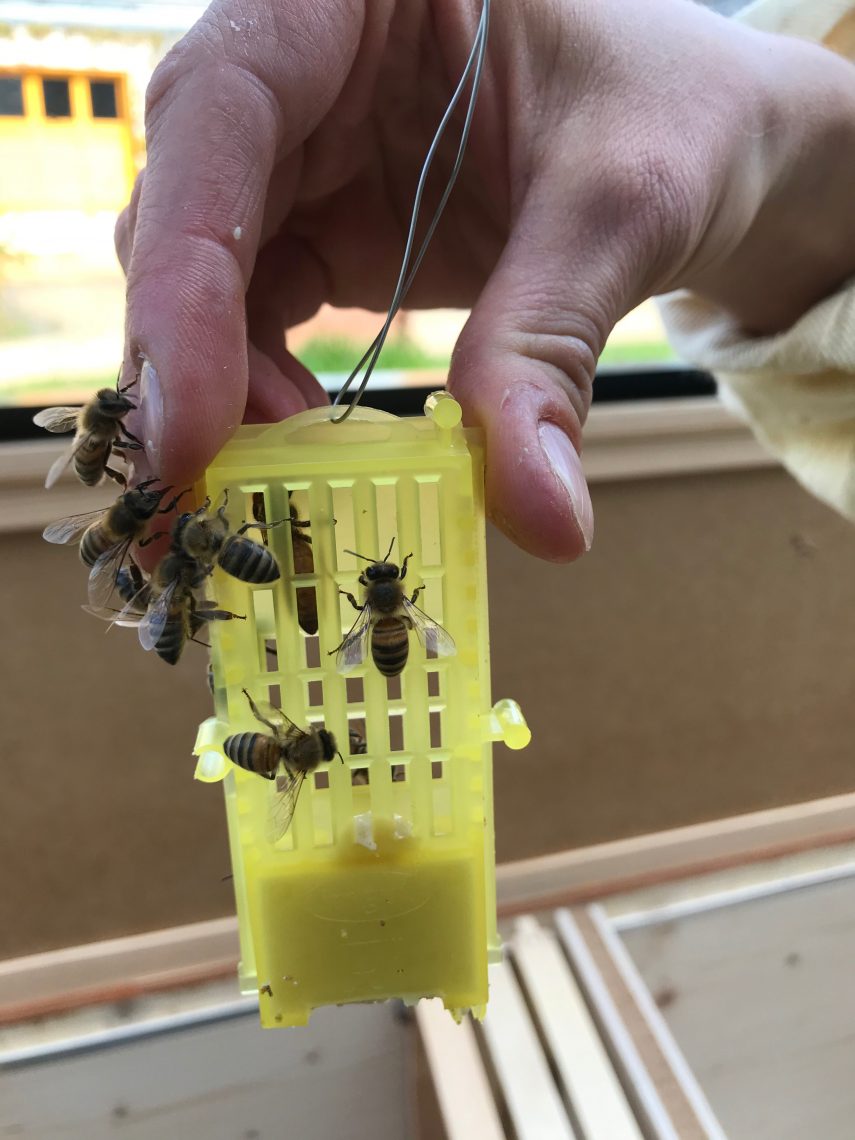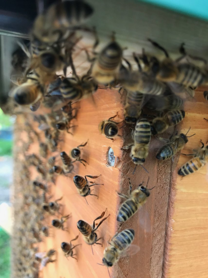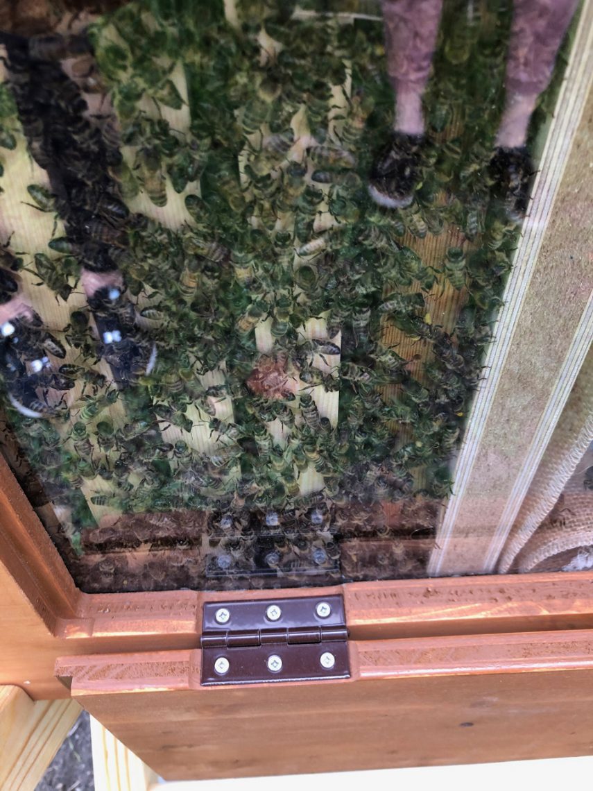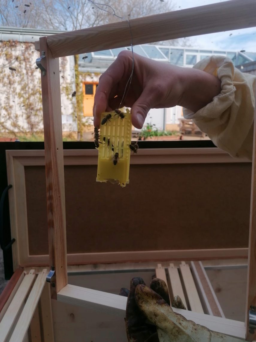 Der Einzug der ersten Bienen auf dem Campus war ein wahres Spektakel. Nachdem die Königin gefunden worden war, wurde sie zuerst in den Stock gesetzt. Dann dauerte es nicht lange, bis die neben dem Stock schwärmenden Bienen ihre Königin entdeckten und wie bei einer Prozession in den Stock einzogen. Dabei reckten sie ihren Hinterleib in die Höhe und sendeten Duftstoffe aus und teilten so anderen Bienen des Schwarms mit, wo lang es in den Stock zur Königin ging. Sterzeln nennt sich dieser Gang, weil die Duftstoffe aus der Sterzeldrüse kommen.