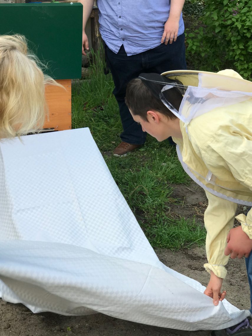 „Die Bienen brauchen einen Bienenstock, in dem sie wohnen. Sie brauchen von uns Zuckerwasser, das sie trinken. Und sie brauchen Blumen, aus denen sie den Nektar sammeln.“